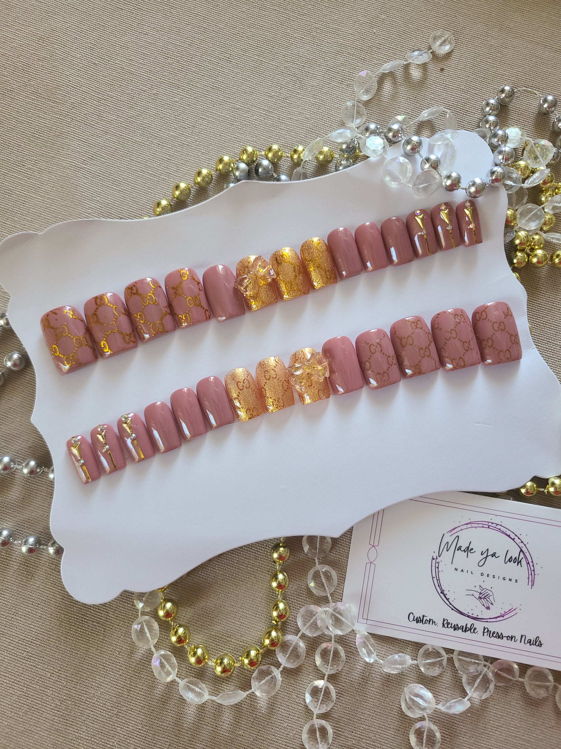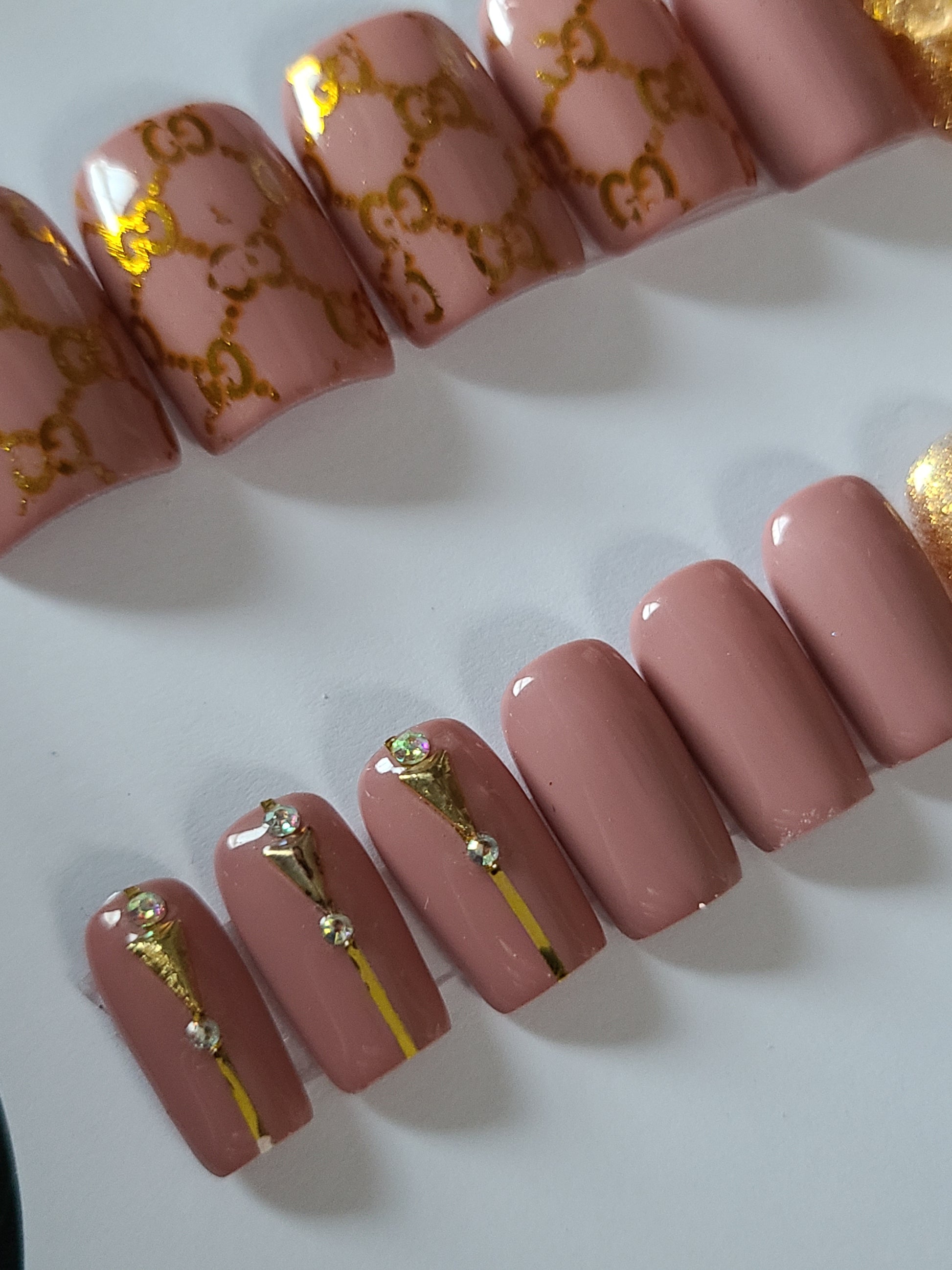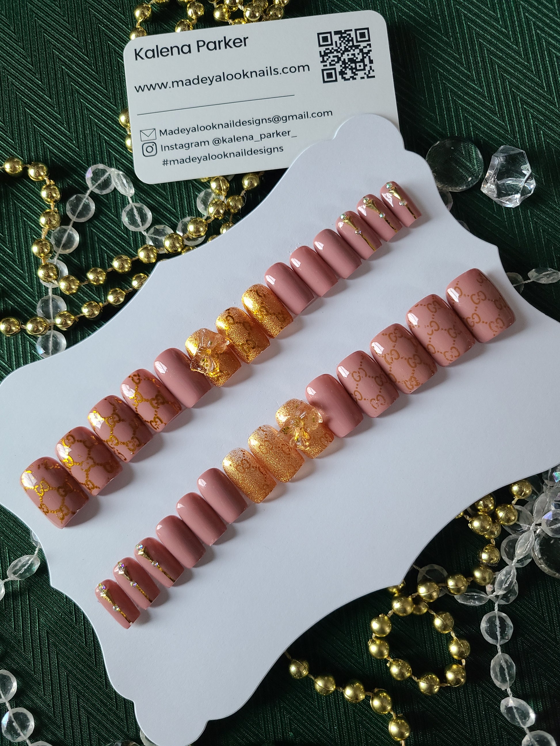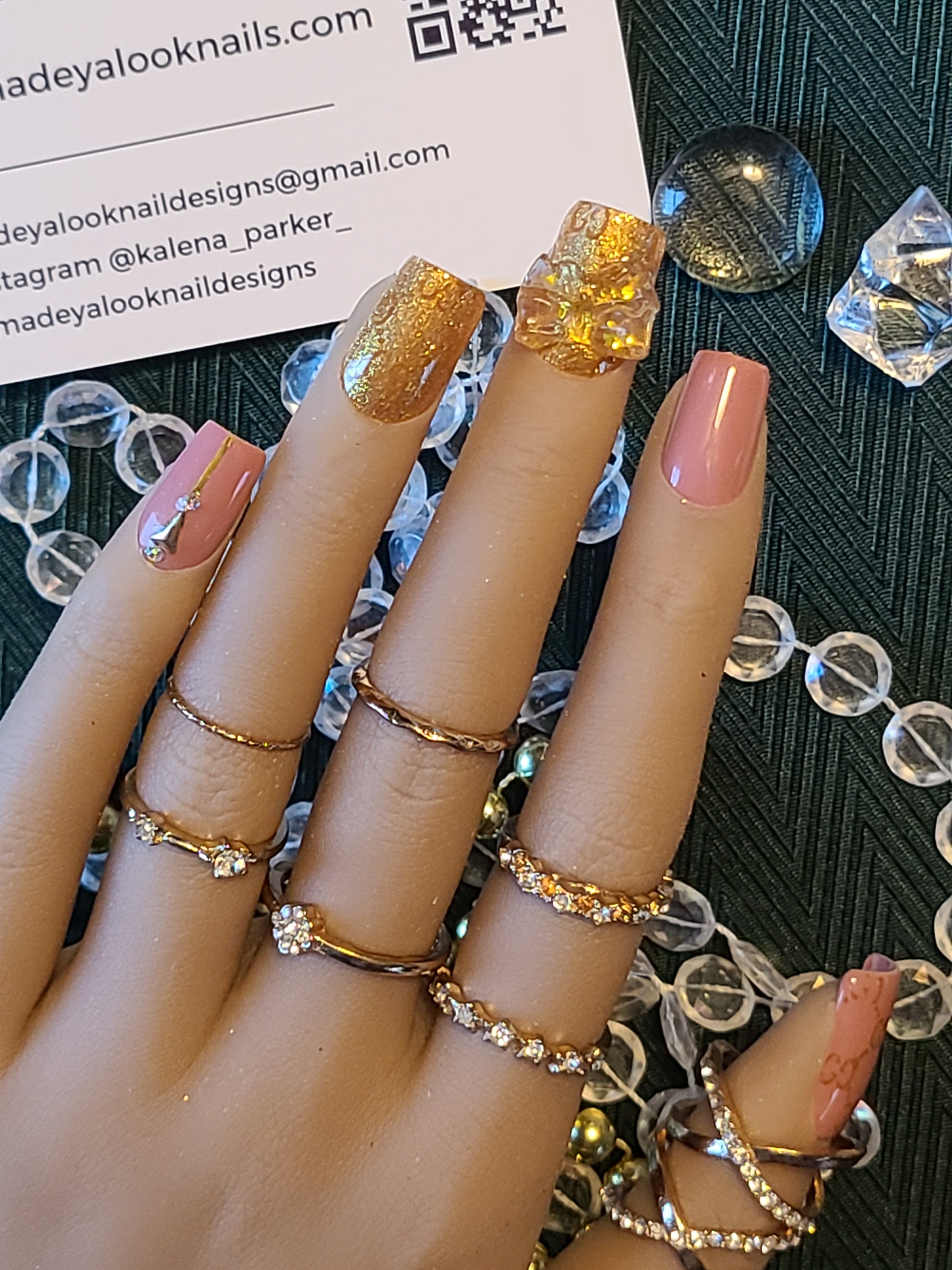 28 piece nail set sold as pictured features 3D Bows, AB crystal gems and gold chevrons