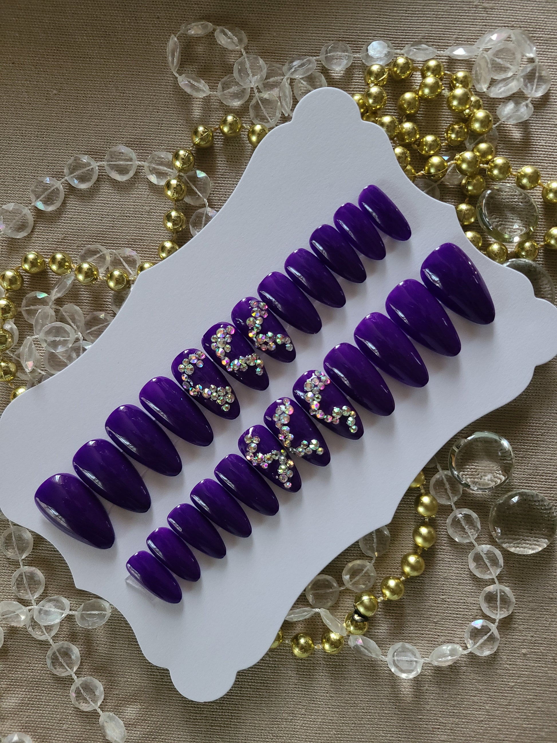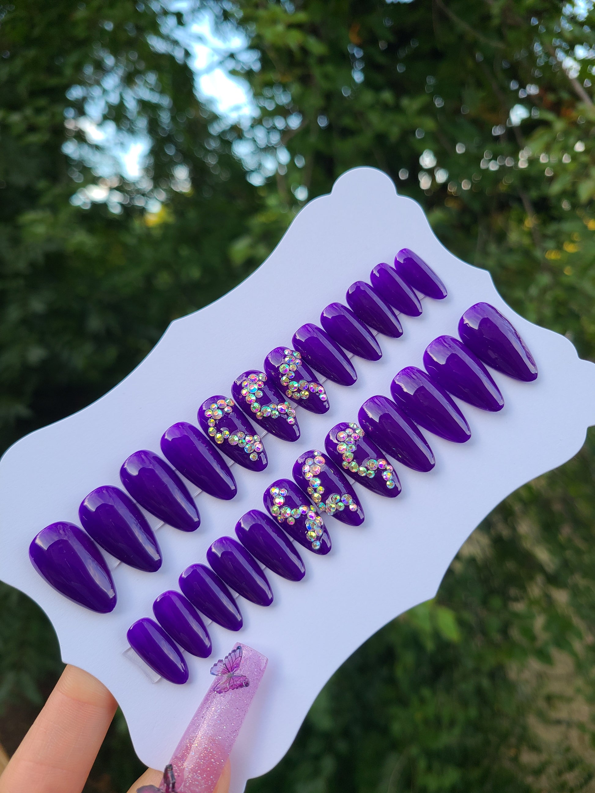 24 piece nail set sold as pictured. Features AB crystal gem embellishments.