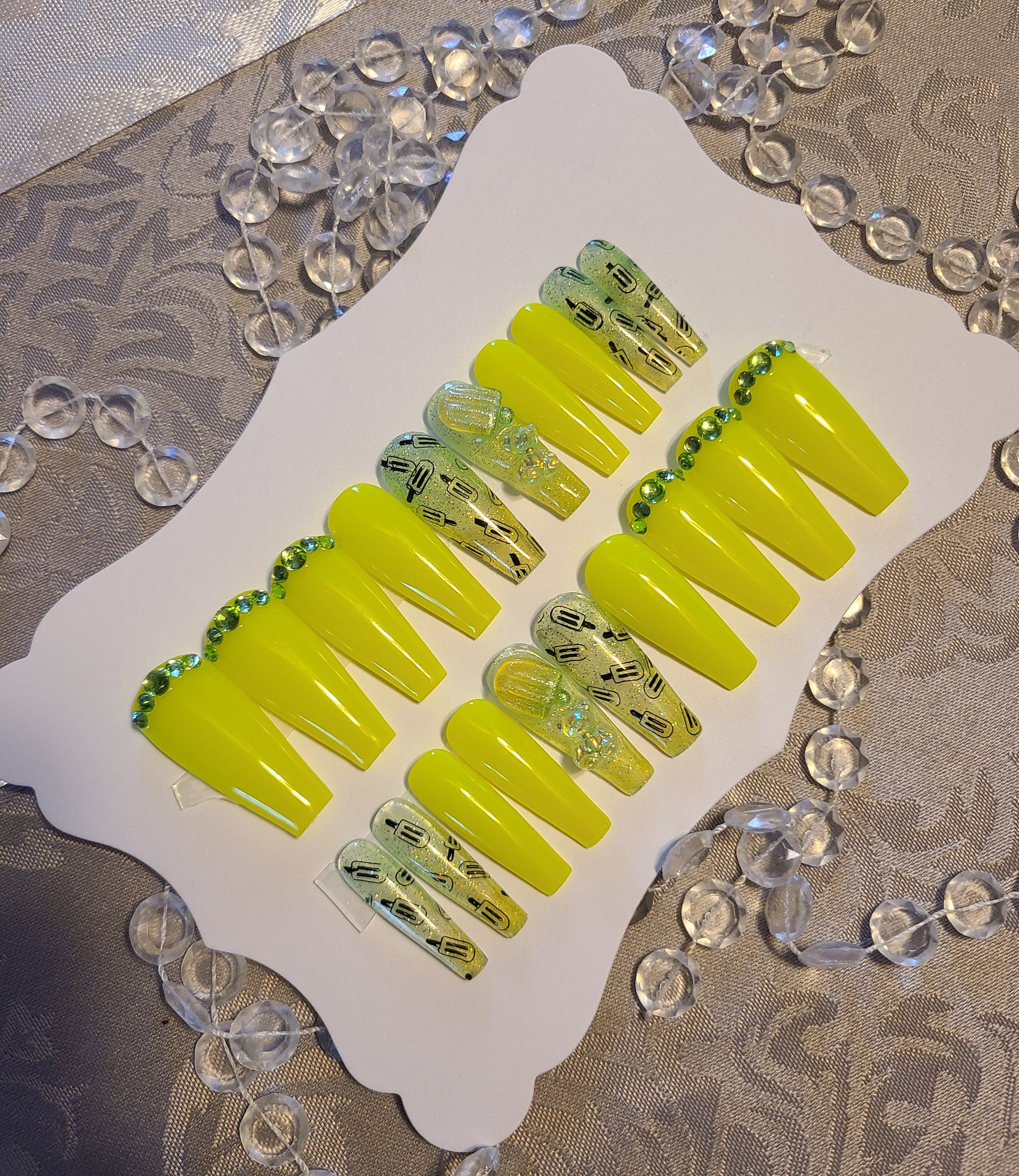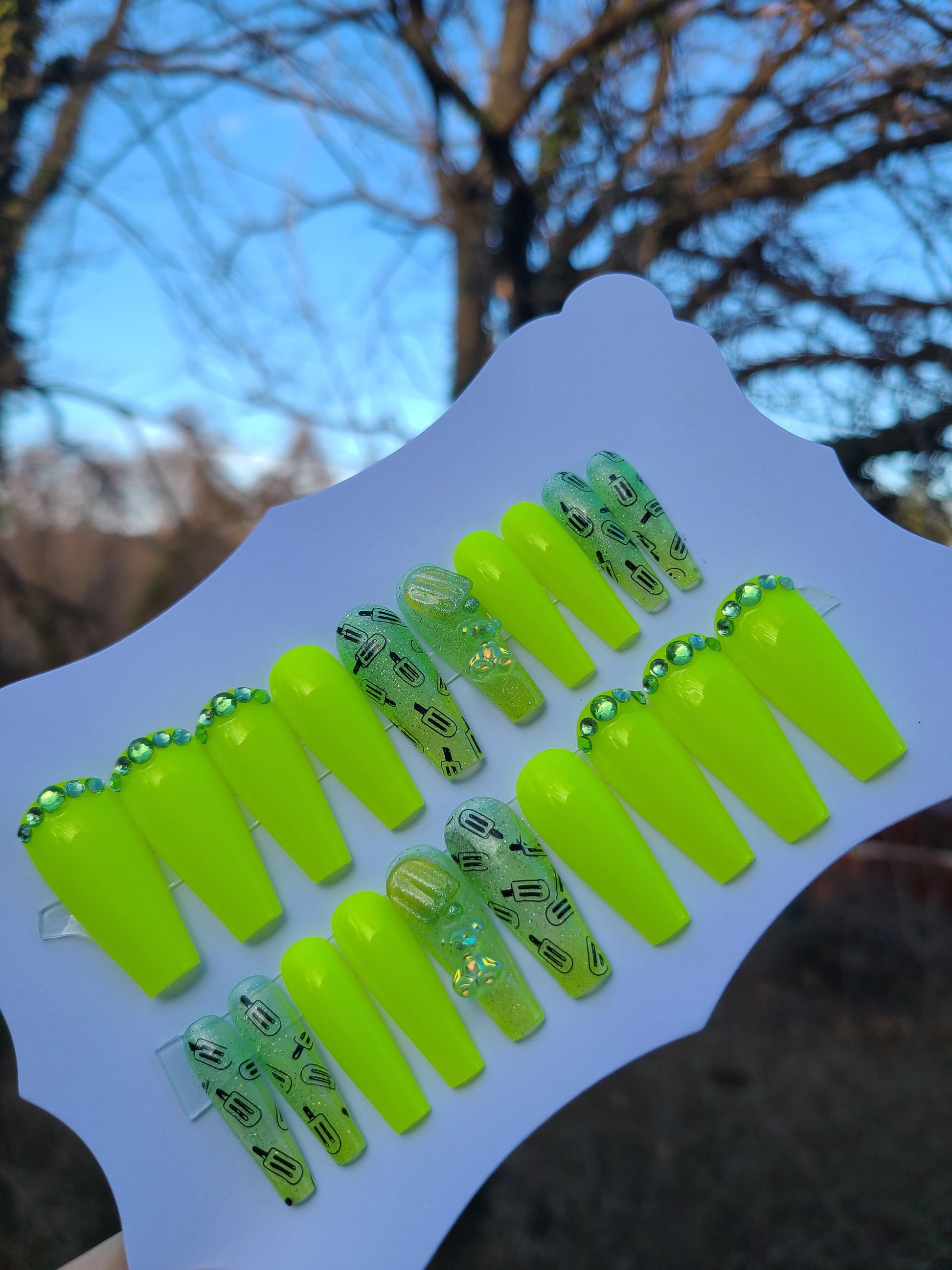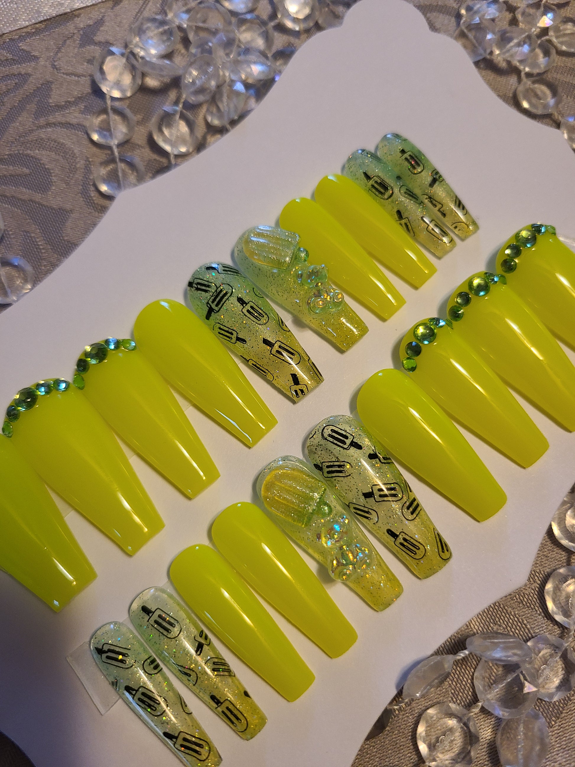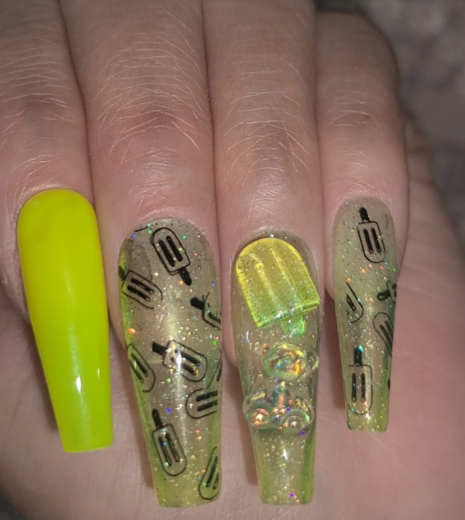 20 piece nail set sold as pictured. Features 3D gummy bear and Ice lolly charms with green Rhinestones.