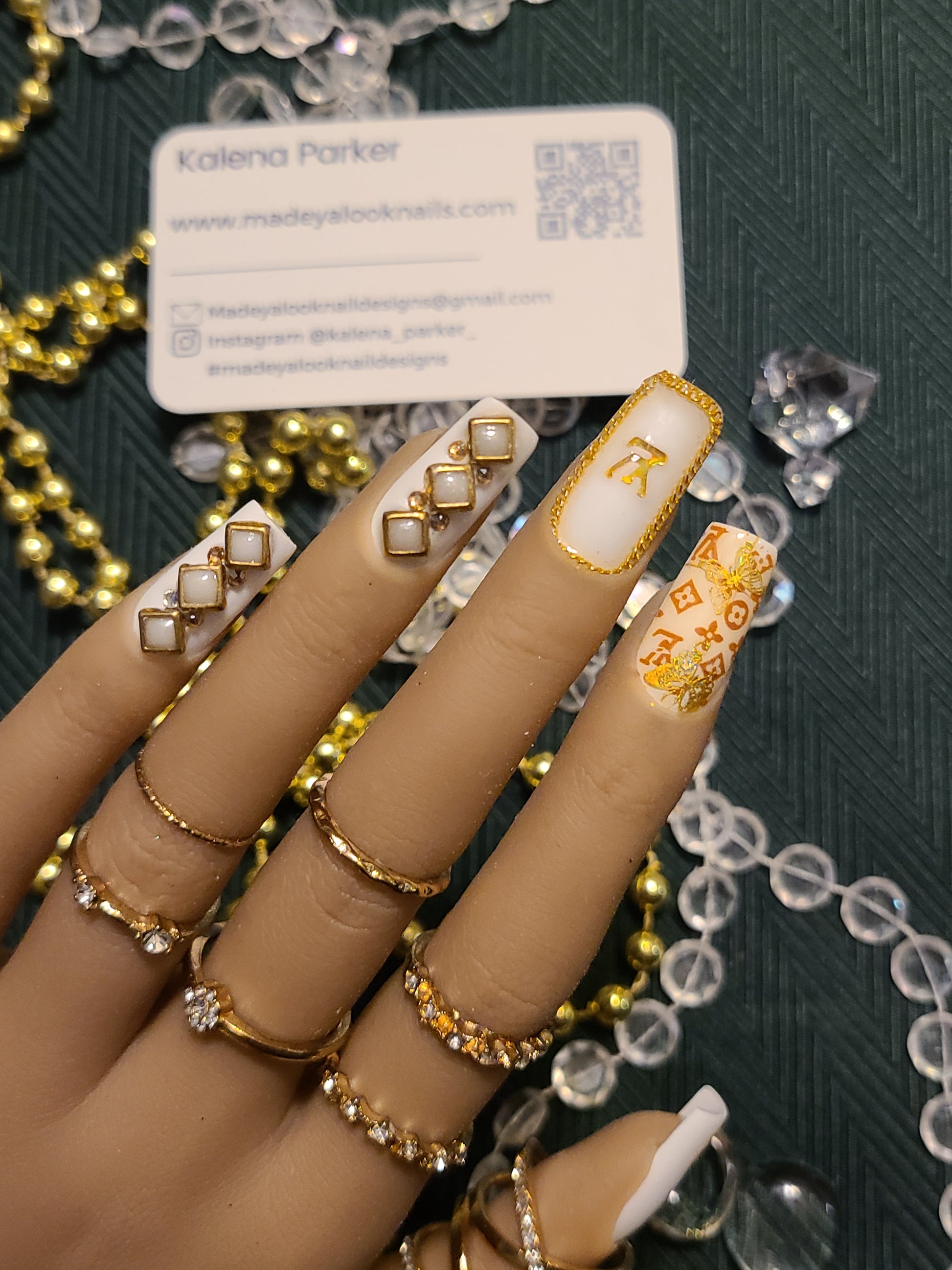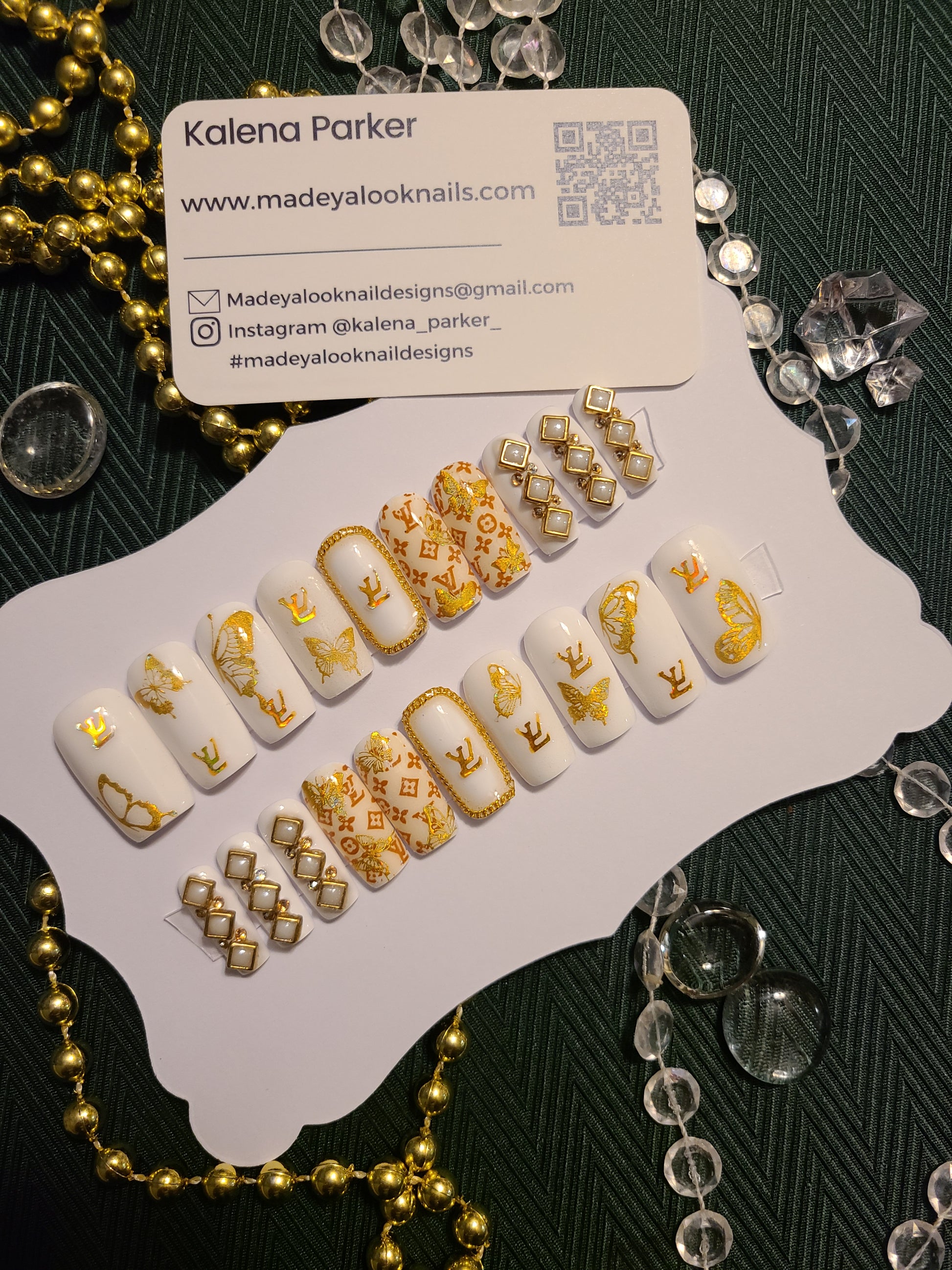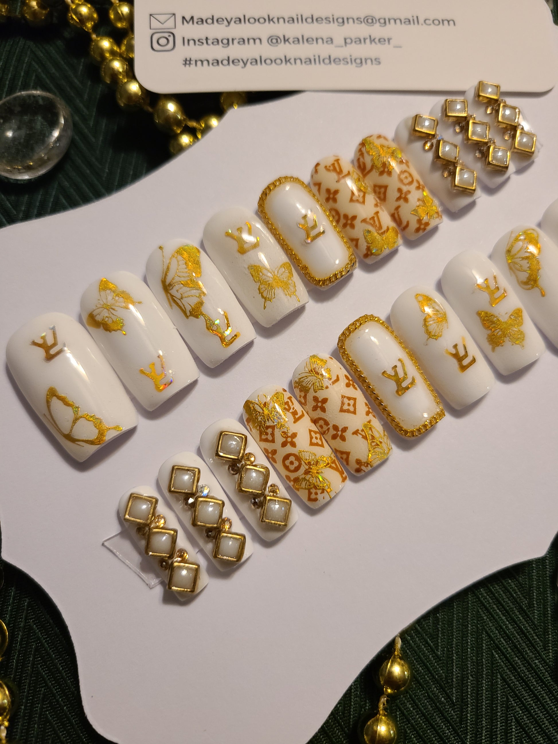 20 piece nail set sold as pictured features pearl/champagne crystal gems, and gold chain embellishments