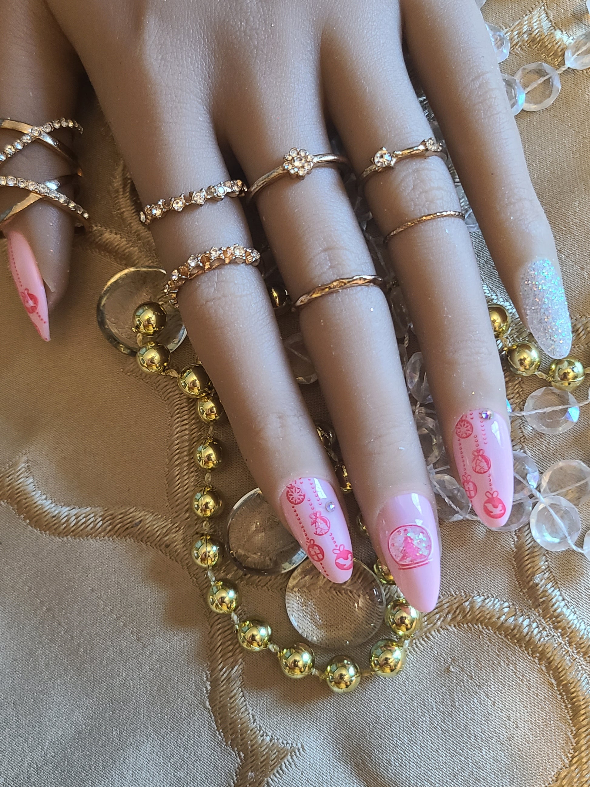24 piece nail set sold as pictured. Features 3D snow globes, AB rhinestones, and "sugar" glitter effect embellishments.