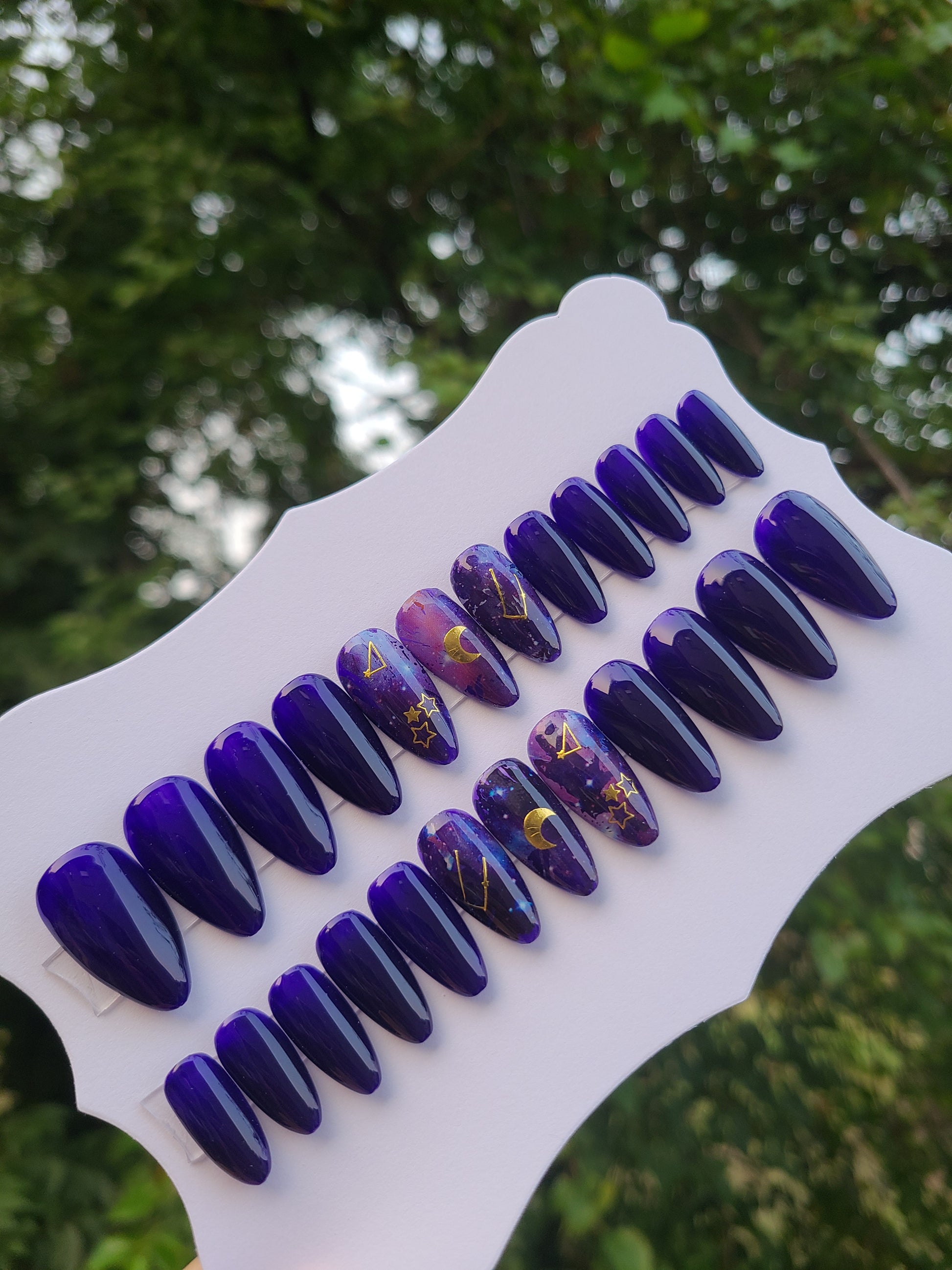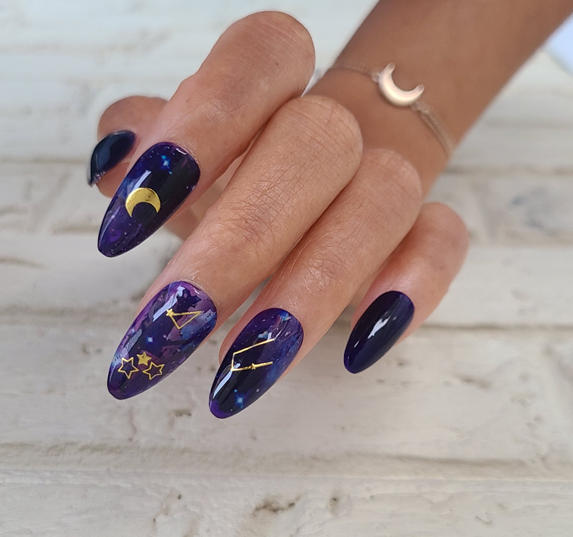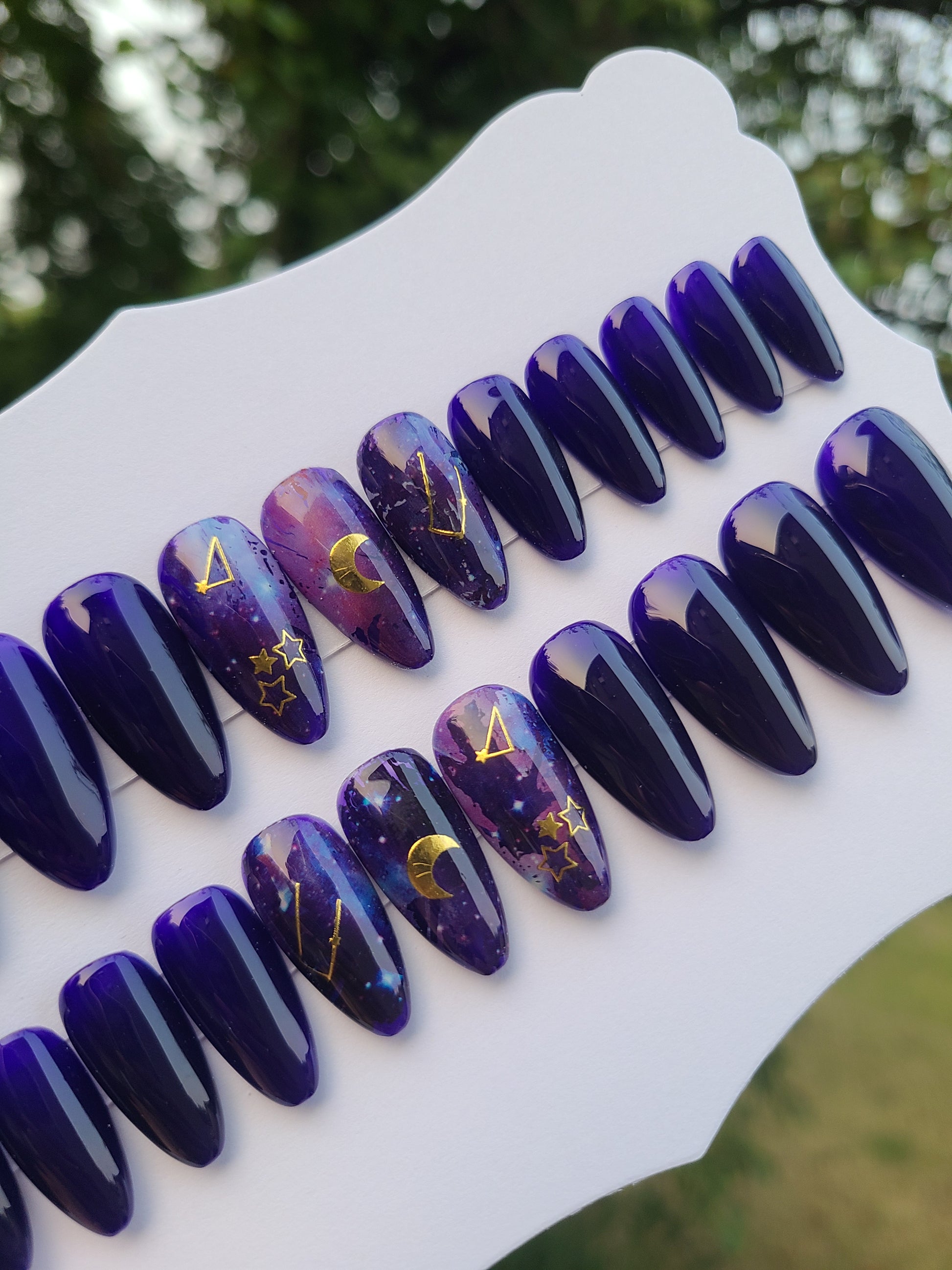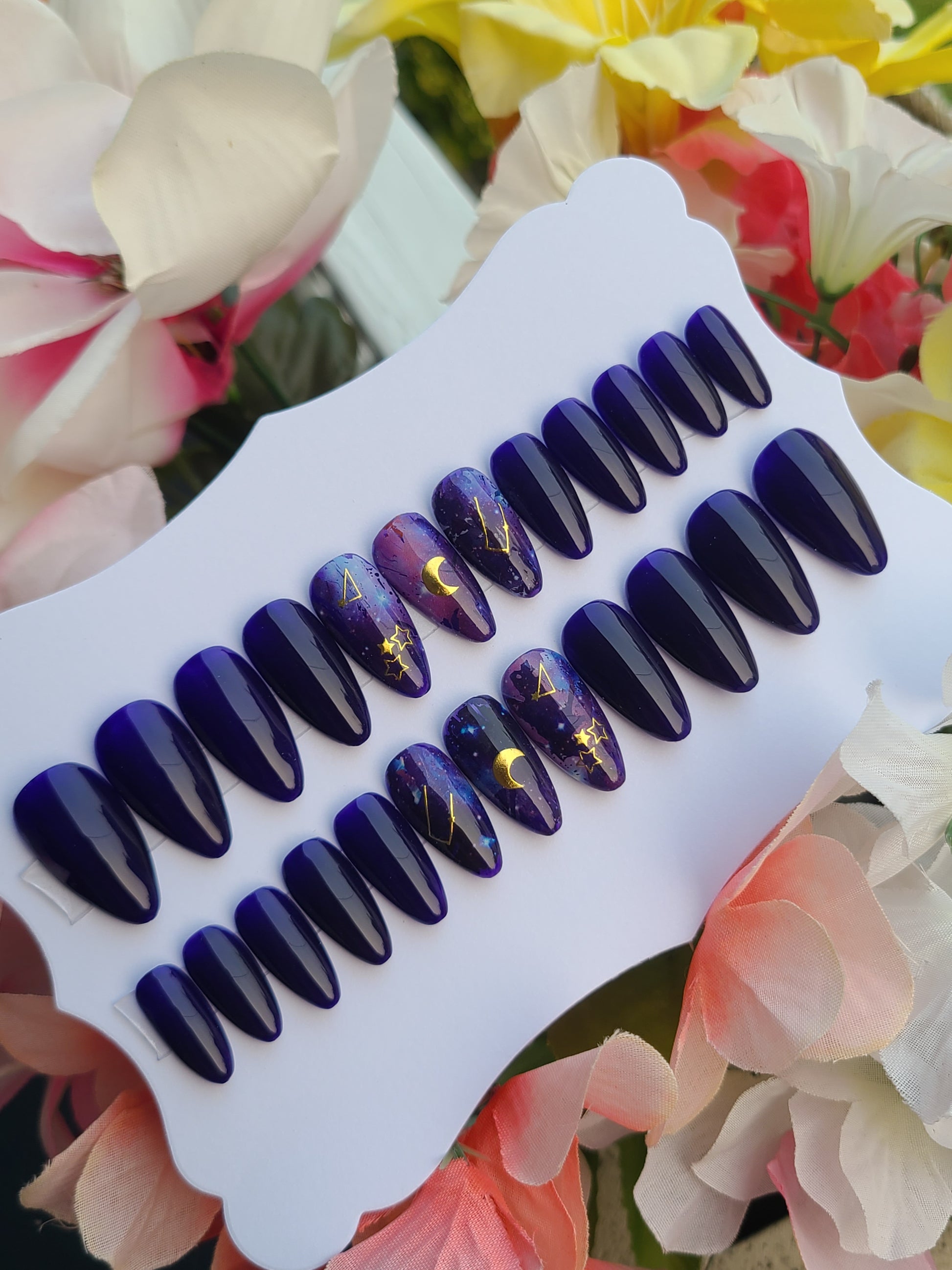 24 piece nail set sold as pictured. Features galaxy print with gold moons and stars.