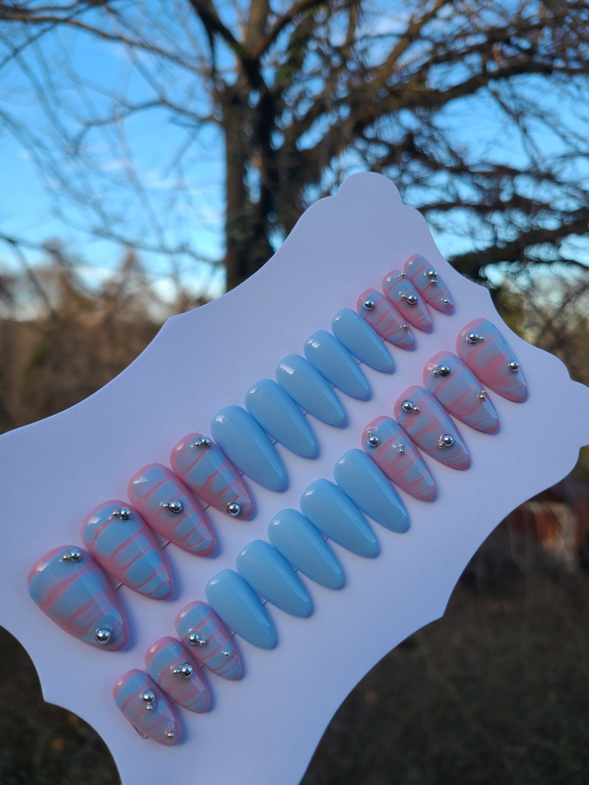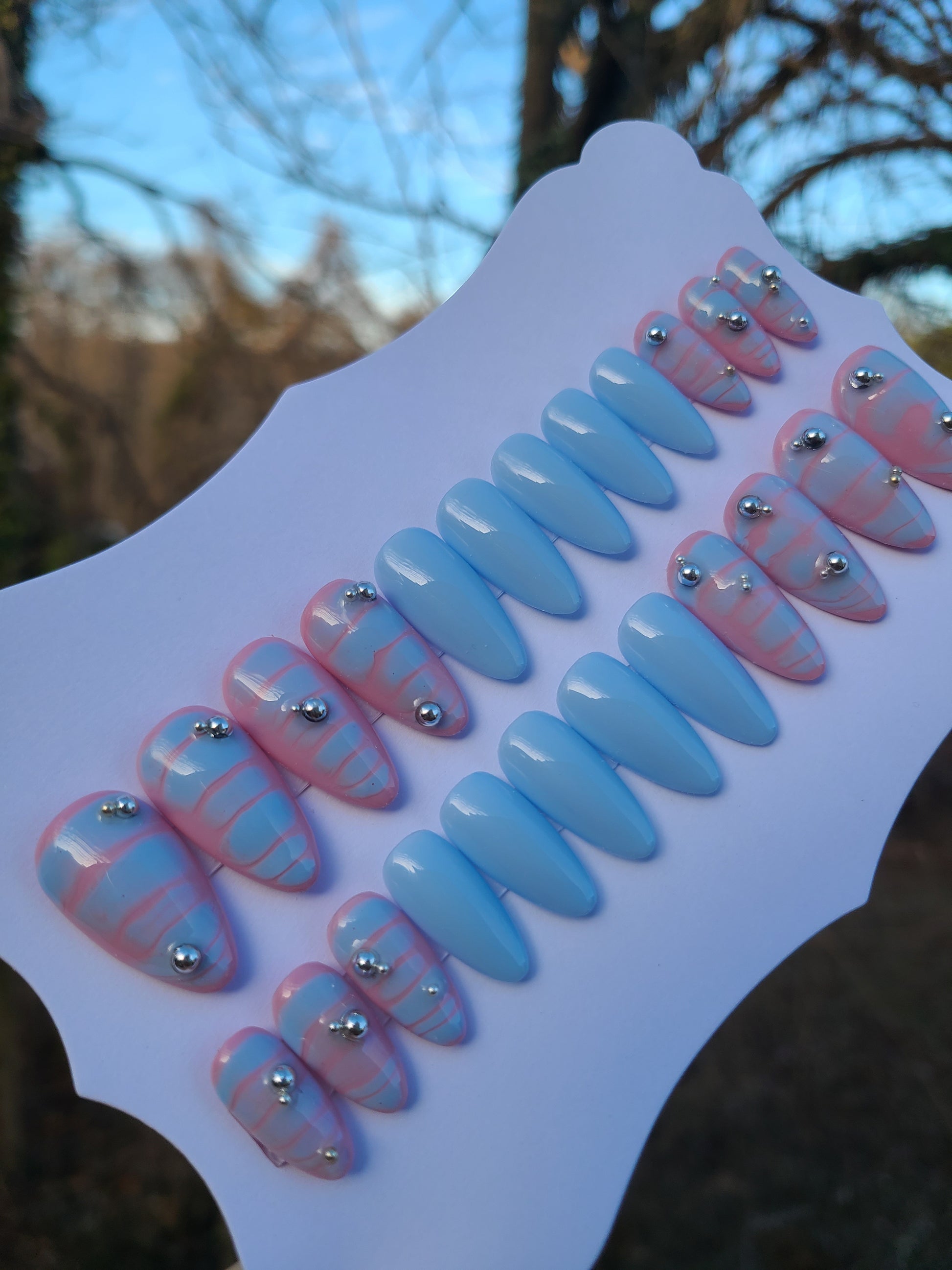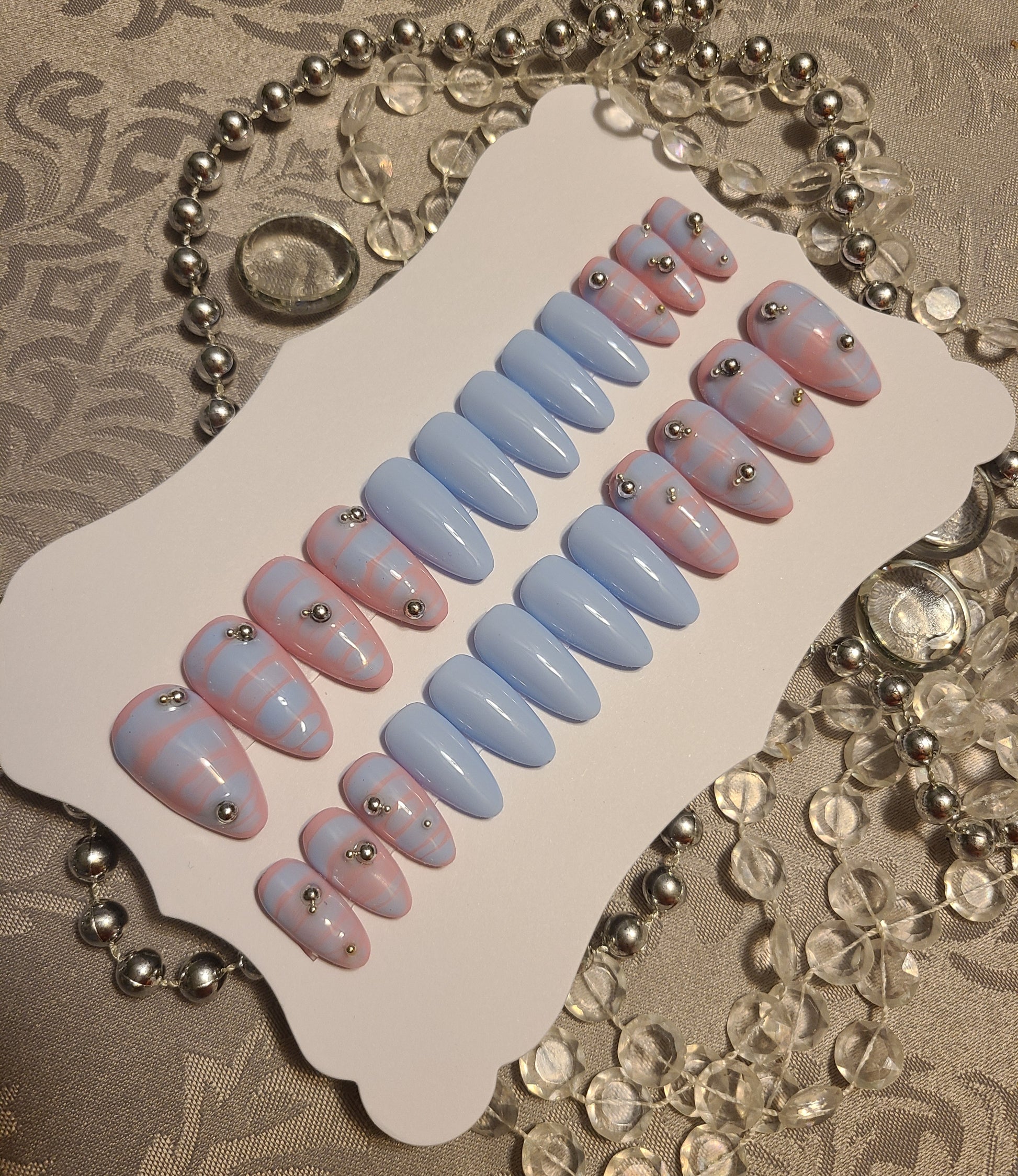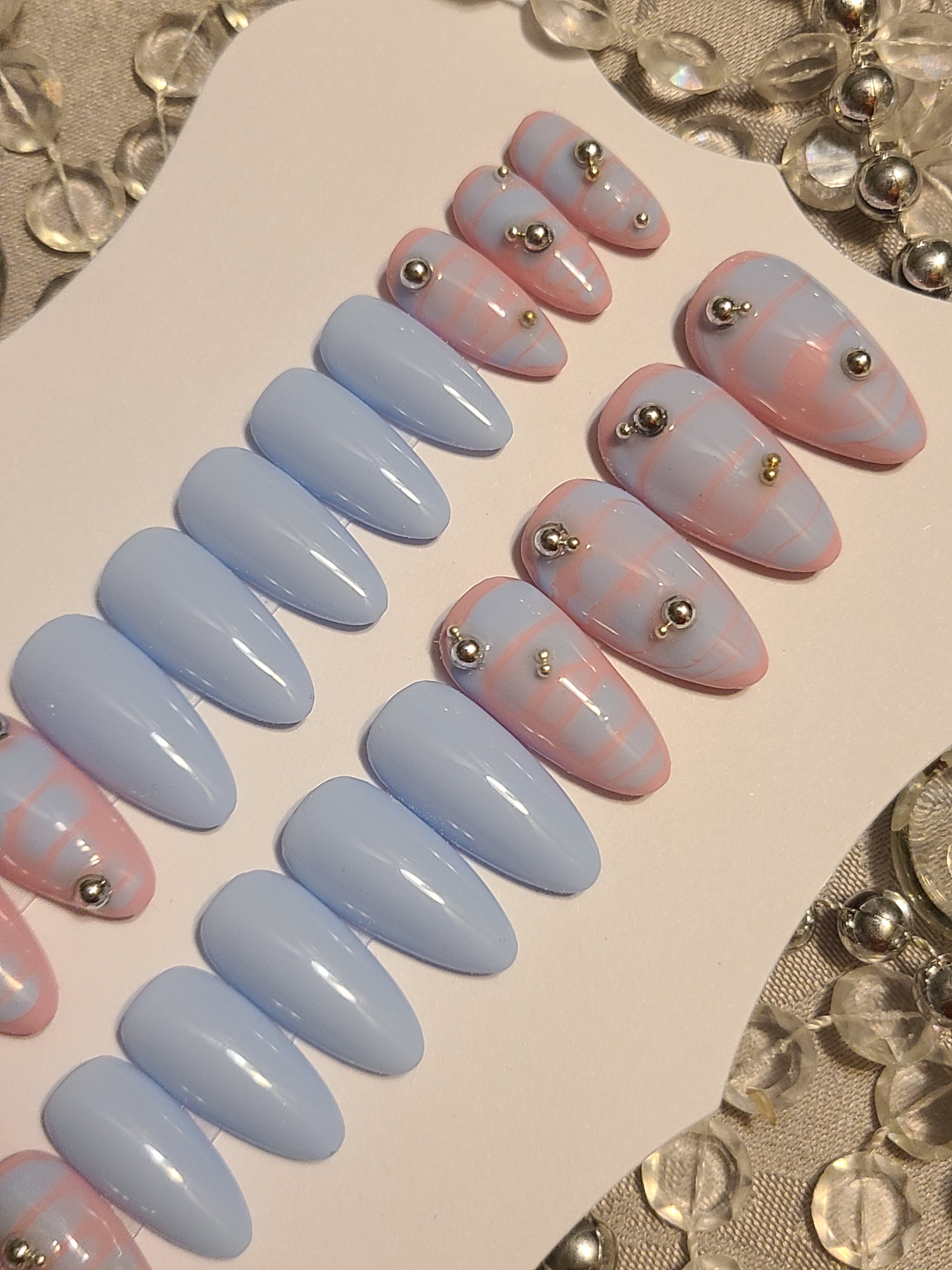 24 piece nail set sold as pictured. Features 3D silver chrome pearls.