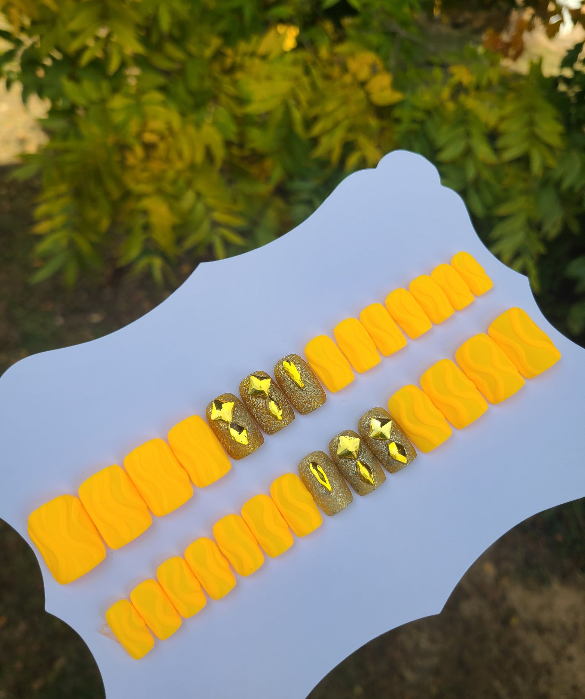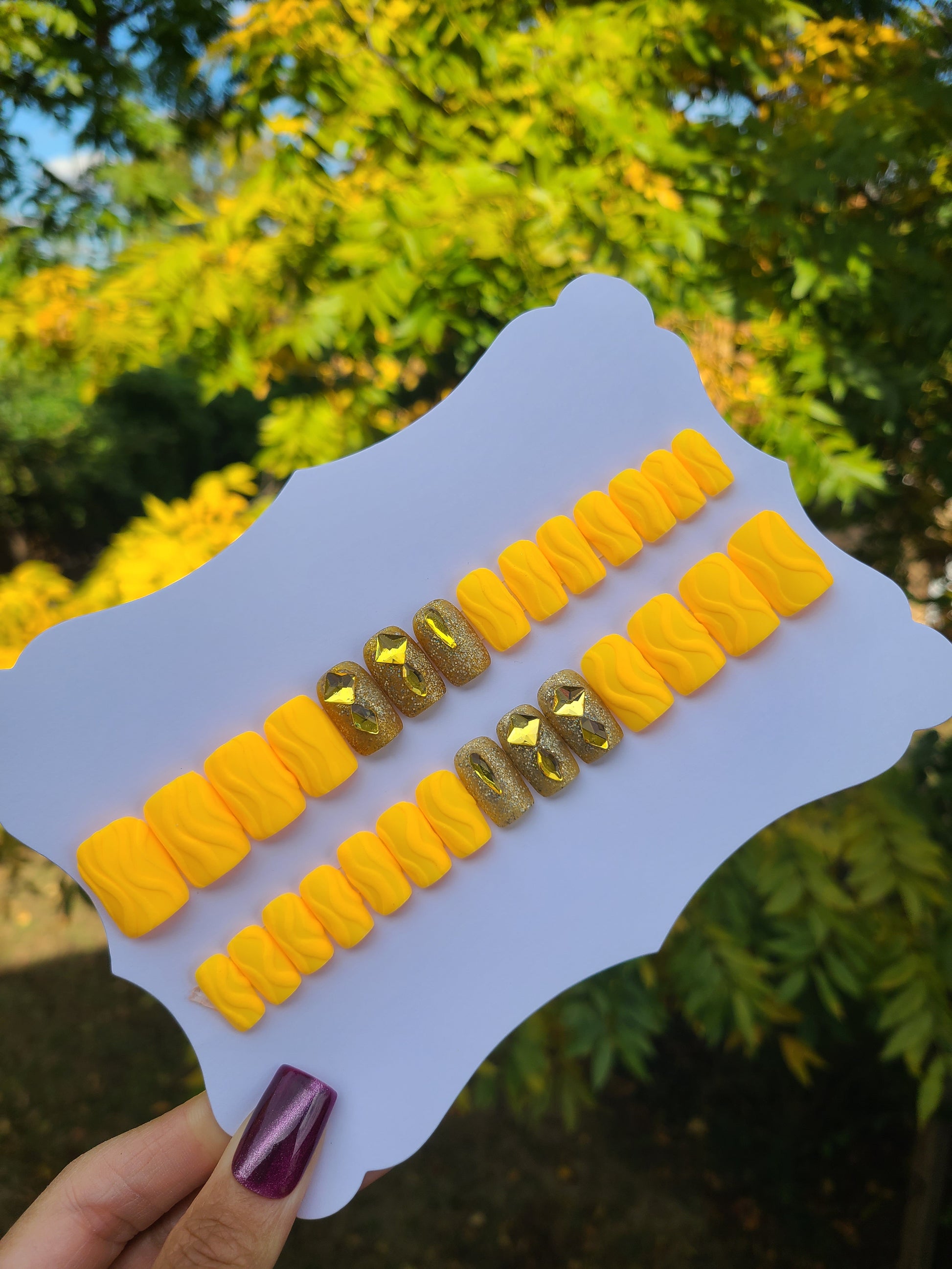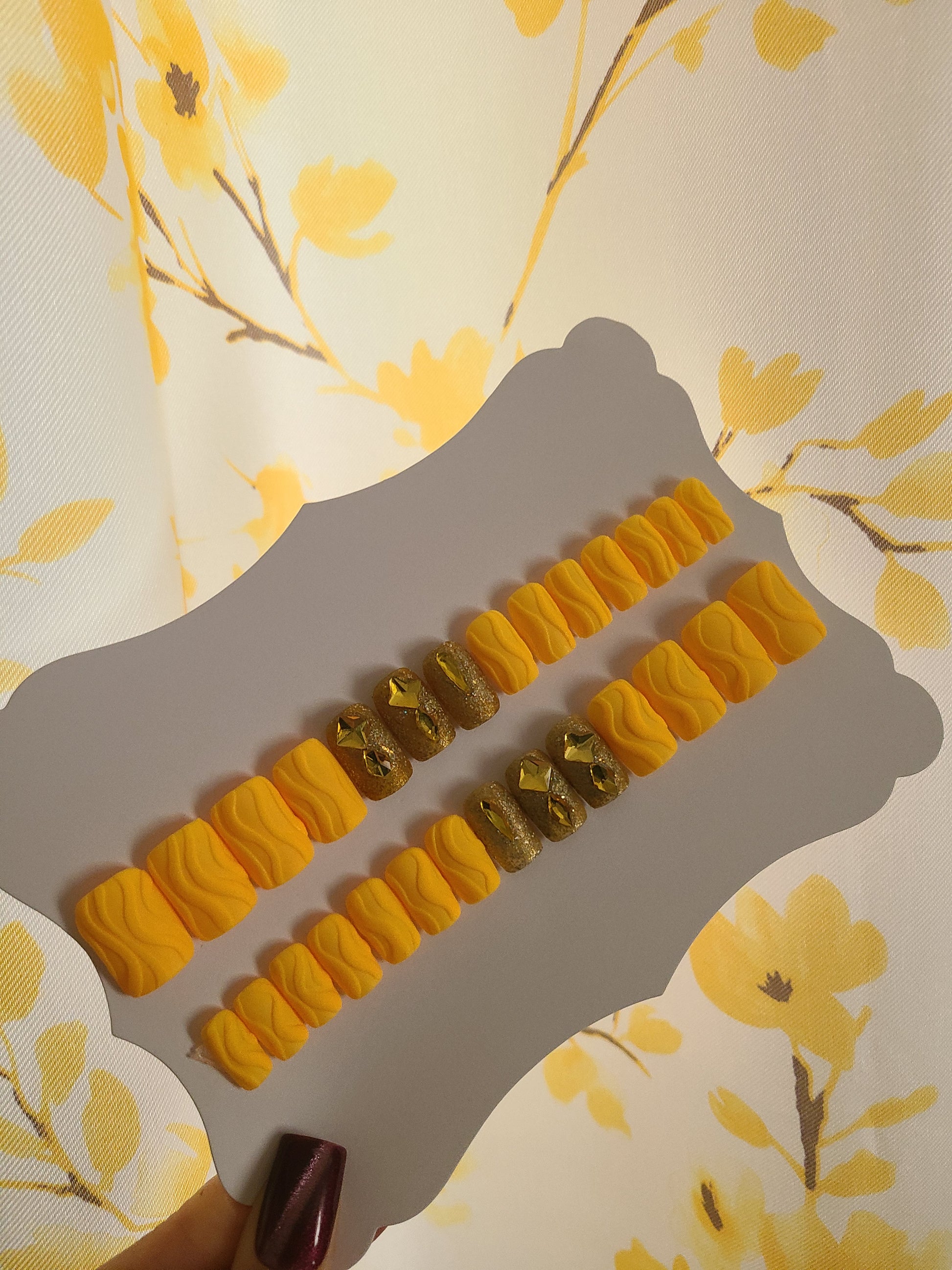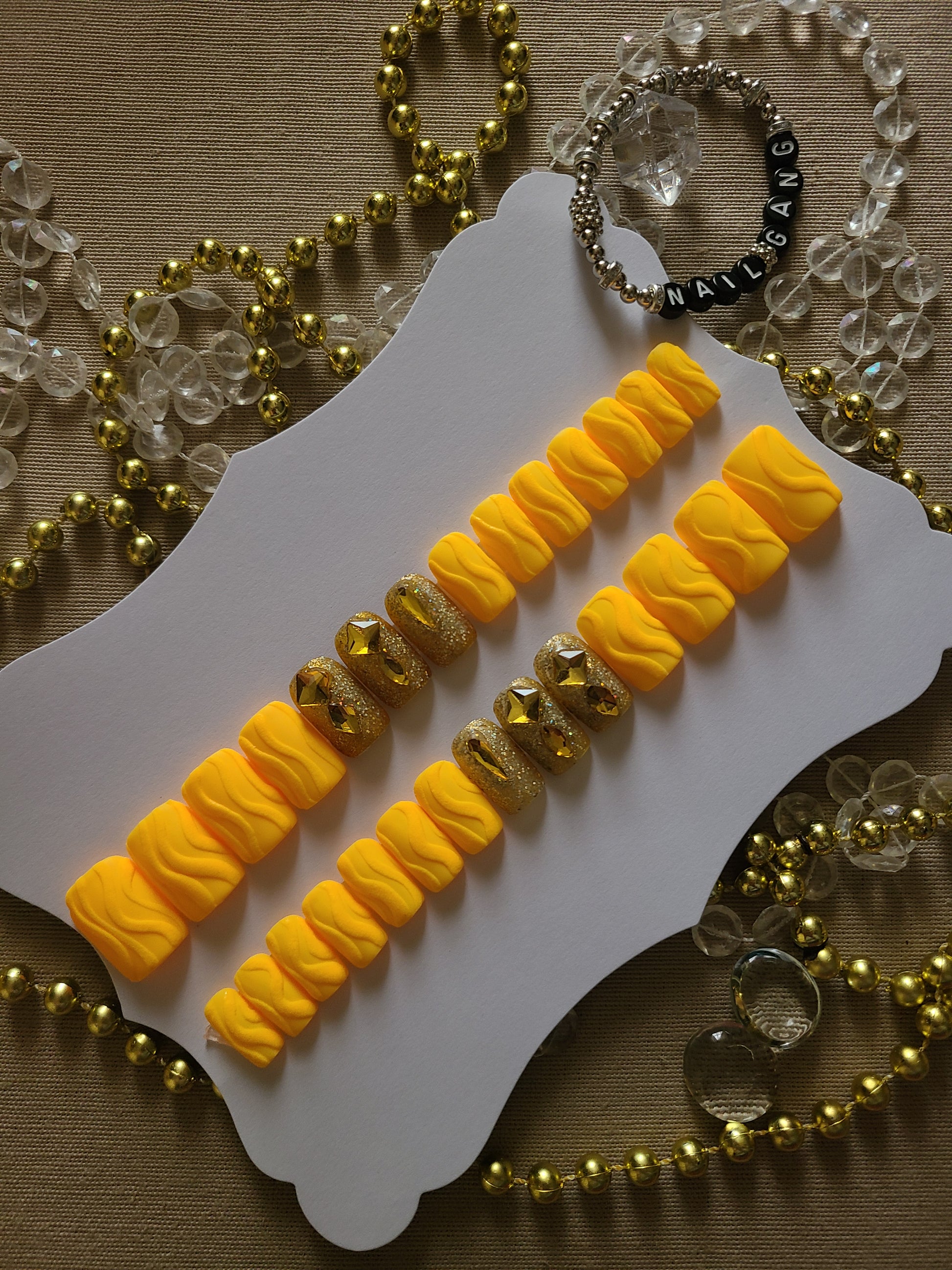 28 piece nail set sold as pictured. Features yellow rhinestone embellishments and textured wavy line designs.
